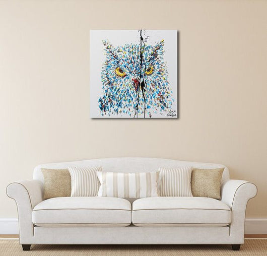 The owl is the unrivaled symbol of intelligence or wisdom. In the ancient mysteries Athena WAS the owl as well as the goddess of wisdom. He has large yellow eyes and brushstrokes that flow . He is mostly built from cool, calming colors with touches of warm colors for purposes of emphasis. A swirling black splash that flows and emphasizes the owls beauty and its dynamism, and adds a dimension of lack of control and definition to a modern work of art of a wise and unique animal.